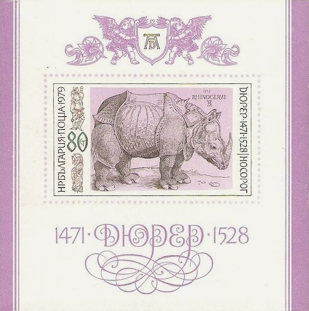 The iconic rhino woodcut is seen below, together with a miniature sheet issued by Bulgaria in 1979 (not my scan), in connection with a set of 4 stamps with other Dürer engravings. Below it you can see a version from the Maldives which I found in my collection of miscellaneous stamps. Dürer's art can be found on many stamp sets from many different countries. One could even start a special collection of Dürer stamps.